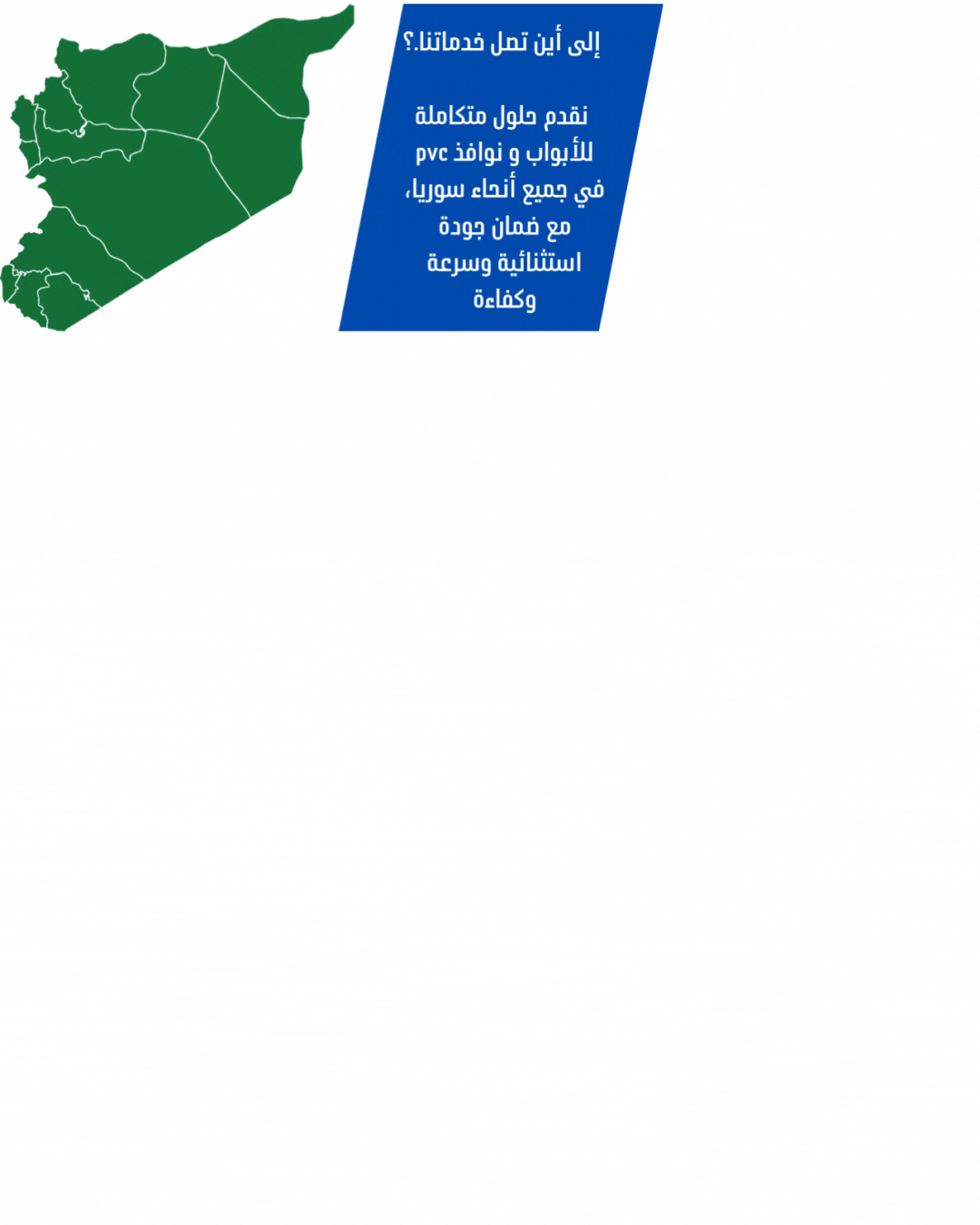 “نتميز بتقديم نوافذ وأبواب PVC عالية الجودة بتصاميم عصرية وخيارات مخصصة، مع عزل حراري وصوتي مثالي. نستخدم أفضل المواد لضمان المتانة، ونسعى لإرضاء عملائنا في جميع أنحاء سوريا بخدمة دقيقة ومنتجات استثنائية.”